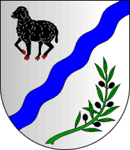 Shield Argent a bend wavy Azure, in dexter chief a sheep Sable animated and armed Gules, in sinister base an olive Branch Vert fructed Sable.