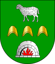 Shield Vert three roof tiles Or arrayed in fess, in chief a sheep passant Or, in base a kiln Argent masoned Sable and a flame Gules.