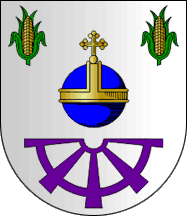 Shield Argent an orb Azure garnished Or, in chief two maize ears Or leafed Vert, in base a watermill wheel Purple dimidiated.