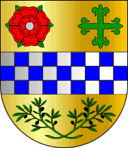 Shield Or a fess chequy of Azure and Argent, in dexter chief a rose Gules barbed Vert and seeded Or, and in sinister chief a cross fleury Vert, in base two olive branches Vert fructed Sable with their proximal ends in saltire.