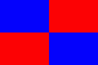 It is a fairly typical Portuguese municipal flag, with the coat of arms centred on a red and blue quarterly (town rank) background.
