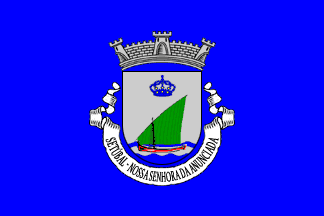 Shield Argent, a ship - the ship is shown not issuant from the wavy base, but upon it, an arrangement not unusual in Portuguese local heraldry, namely Lisboa itself, though not any less wrong for it. It is termed to be specifically a canoa do alto, the kind of detail that goes against the spirit of the law - Sable garnished Argent and Gules with masts and rigging Sable and with sail Vert sailing upon a base wavy Azure charged with a barrulet wavy Argent, in chief a Marian crown Azure gemmed Or. Mural crown Argent with three visible towers (village rank) and white scroll reading in black upper case letters "SETÚBAL - NOSSA SENHORA da ANUNCIADA".