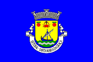 Shield Or; a ship Azure with masts and rigging Azure and with its sail Argent furled; it is termed to be specifically a tartana, the kind of detail that goes against the spirit of the law; issuant from base wavy Vert charged with a barrulet wavy Argent; in chief a crab Gules holding a cross Sable, flanked by two oranges Gules (sometimes depicted OR) leafed Vert. Mural crown Argent with three visible towers (village rank) (commune rank) and white scroll reading in black upper case letters "SETÚBAL - SANTA MARIA DA GRAÇA".