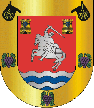 Shield chequered of nine, five fields wavy of Azure and Argent, four fields Argent and charged, among the latter are two fields in flanks displaying a bunch of oranges leaved Vert, one field in central chief displaying a mattock Gules and one field in base displaying a weaver's shuttle Gules.