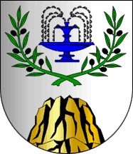 Shield Argent a fountain playing Azure surrounded by two olive branches Vert fructed Sable with their proximal stems in saltire, issuant from base a craggy mound Sable garnished Or.