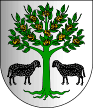 Shield Argent a chestnut tree eradicated Vert fructed Or ,flanked by two sheep Sable passant respectant.
