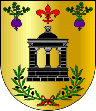 Shield Or two eradicated olive trees Vert fructed Sable in fess, in chief a turnip Purple leafed Vert, in base two Roman swords Sable in saltire. Mural crown Argent with three visible towers (village rank) and white scroll reading in black upper case serifed letters "NABO".