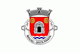 Shield Gules with base wavy of Argent and Azure, a porticus Argent masoned Sable with door of the same, in chief two watermill's wheels Or ordered per fess. Mural crown Argent with three visible towers (village rank) and white scroll with inscription in black initials "ARNOSO - SANTA EULÁLIA".