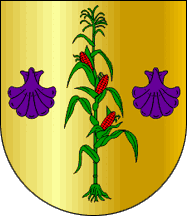Shield Or a maize plant eradicated Vert fructed Gules, flanked by two escallops Purple.