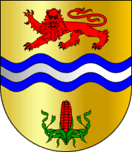 Shield Or a fess wavy Azure, charged with a bar wavy Argent, in chief a lion passant guardant Gules armed Sable, in base a maize ear Or leafed Vert.