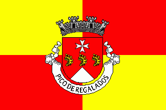 Shield Vert a wing Or between a palm frond of the same in fess on chief and two millstones of the same ordered per fess on base. Mural crown Argent with four visible towers (town rank) and long white scroll, as used by united communes,often reading in black upper case serifed letters "UNIÃO DAS FREGUESIAS DE PICO DE REGALADOS, GONDIÃES E MÓS".