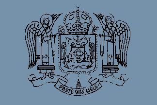 Ivan's image differs from this photo of the flag – the flag the main shield is red, not blue. I can't be sure of the color of the smaller shield, but enlarging the flag graphic hints it might be blue (which would make sense). The angel on the hoist flag has gold wings, not white, and a red stole, not gold; the angel on the fly side has gold wings, not white, and a blue stole, not gold; the scroll below the angels is blue in the fold on the hoist end, gold in the center fold, and red in the fold on the fly end. The tassel suspended from the bottom of the shield is red.