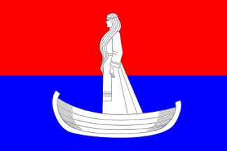 a banner of arms, divided red over blue, approximately 2:1 by a white scrolled