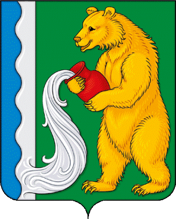 On a green field with a wavy azure and silver right edge – a golden, rebellious bear holding a red jug in its forepaws, from which flows a silver stream, merging with the edge below.