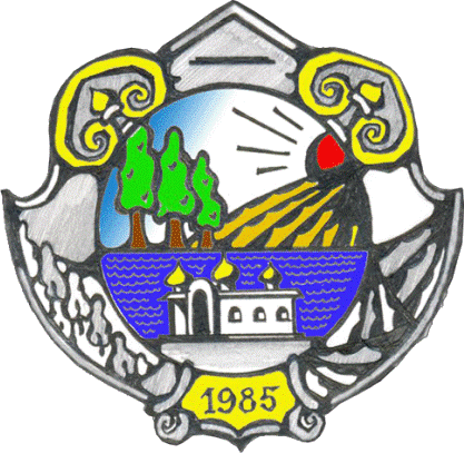 The coat of arms is a circle framed by stylized images of trees, a plowed field, and church domes. The circle is divided into two parts horizontally.