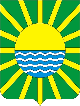 In a green field, a bezant-ball crossed with gold and azure, burdened in azure with four wavy silver belts, in radiance, the rays of which extend beyond the shield.