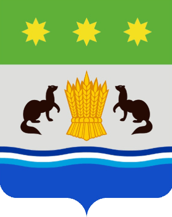 On a silver field, two sables and a sheaf of wheat, accompanied by three gold eight-pointed stars on an upper green field. The silver field stands on three wavy lines (blue, white, and light blue), which smoothly flow into the blue lower heraldic field.