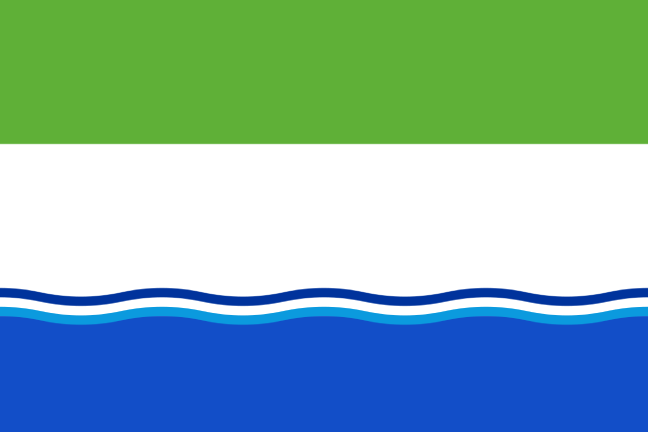 A rectangular cloth with a width-to-length ratio of 2:3, consisting of three equal horizontal stripes: the top stripe is green; the middle stripe is white, echoing the color of the middle silver field of the heraldic shield; the bottom blue stripe is separated from the white stripe by three wavy lines (dark blue, white, and light blue). The three wavy lines occupy one-fifth of the bottom blue heraldic stripe, or one-fifteenth of the entire heraldic field of the flag.