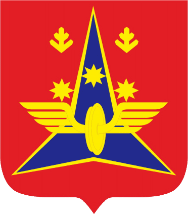 On a red field, an azure three-pointed star edged with gold, the uppermost ray of which is charged with a gold star with eight points and flanked by two identical stars and, above them, two gold fir trees; above all, a gold winged railway wheel (the wheel is in the center of the three-pointed star, the wings extending beyond it, below the stars that accompany its uppermost ray).