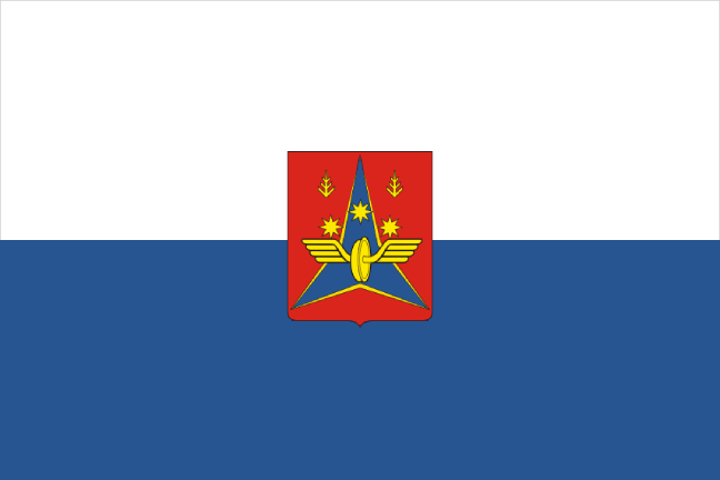 The flag was developed based on the coat of arms of the City of Kotlas and is a rectangular cloth of two horizontal equal stripes, the upper one being white and the lower one being blue, with the image of the coat of arms in the center of the flag, placed in a French shield. The coat of arms is a gules field on which is inscribed an azure three-pointed star, the upper ray of which is burdened with a golden star with eight rays and accompanied on either side by two similar stars and above them by two golden fir-trees; on top of all this there is a golden winged railway wheel (the wheel is in the center of the three-pointed star, the wings extend beyond it below the stars accompanying its upper ray). The ratio of the width of the shield to the height of the shield is 7:8, the ratio of the width of the flag to its length is 2:3. The overall width of the main element of the flag - the coat of arms, should be 1/5 of the length of the flag cloth.