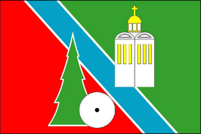 A rectangular cloth with a width-to-length ratio of 2:3, consisting of three centrally symmetrical parts: a red part at the flagpole, a green part at the free edge, and a blue stripe dividing them, edged with white lines at the edges, with a downward slope running from the upper side of the cloth to the lower one. The ratio of the width of the parts (including the edging) at their contact with the upper edge is 3:5:19. Shifted towards the middle, the cloth bears stylized images of a spruce tree, a roll of paper, and a church, partially overlapping the borders of the strip and executed in green, white, black, and yellow colors.