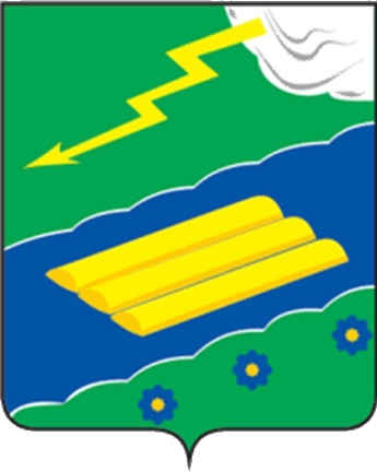 In a green field, an azure (light blue, blue) thinly bordered with silver, lowered obliquely on the left, wavy belt, burdened with a raft of golden logs, accompanied at the tip obliquely on the left by three azure flax flowers with golden centers, thinly bordered with silver; in the upper left corner, a silver cloud, from which a golden lightning bolt (thunder arrow) emerges into the oblique belt on the left.