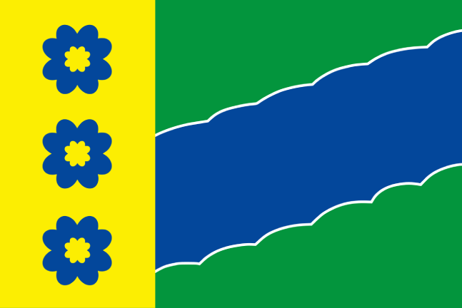The flag's green panel features a schematic representation of a river. Near the flagpole, on a yellow vertical stripe occupying one-third of the panel, are three blue flax flowers. The flag's aspect ratio is 3:2.