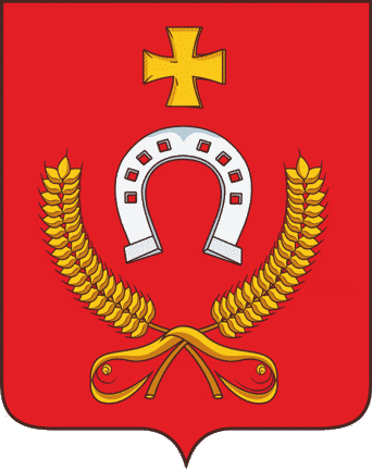 In a red field – a silver horseshoe, horns down, between two golden ears of corn forming a wreath, and accompanied at the top by a golden widened four-pointed cross .