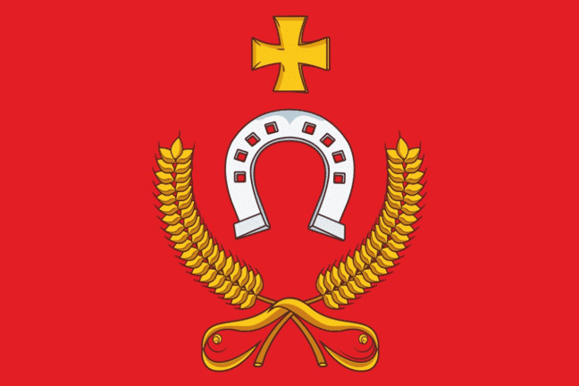 The flag is a rectangular red cloth with a width-to-length ratio of 2:3, depicting a white horseshoe, horns down, between two yellow ears of grain forming a wreath, and accompanied at the top by a widened yellow four-pointed cross.
