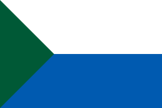 2.1. The flag appears in rectangular bunting, divided in forked manner into three parts (fields N.1, N.2, N.3). The central angle of the isosceles triangle (field N.1) measures 90 degrees. Field N.1 is green, field N.2 is white, field N.3 is (light) blue. The ratio of the width of the flag to its length is 2:3.