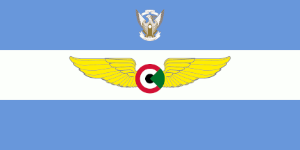 The flag of the Sudanese Air Force consists of three horizontal stripes, blue, white and blue. The Air Force emblem is placed in the middle of the white stripe, a winged roundel.