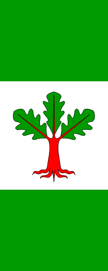 The flag is rectangular in proportions 2:5, vertically divided green-white-green (3:4:3), so that the white field is square, containing the eradicated oak tree from the coat of arms in the middle.