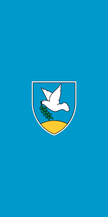 The Decision prescribes the flag as blue, Pantone 2995u, in proportions 1:2, with the coat of arms height being 1/2 of the flag height (I believe that "flag height" here means the shorter flag edge, no matter the flag is horizontal or vertical version - in this regard Stanič & Jakopič's [j2s05] images are incorrect as they show a larger coat of arms, about 2/3 of the height), with vertical and horizontal variants explicitly prescribed.