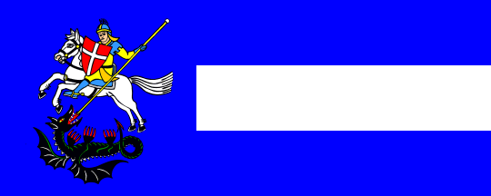 The flag is rectangular, in proportions 2:5, horizontally divided blue-white-blue, with a square blue field at hoist containing the attribute from the coat of arms, St. George slaying the dragon.