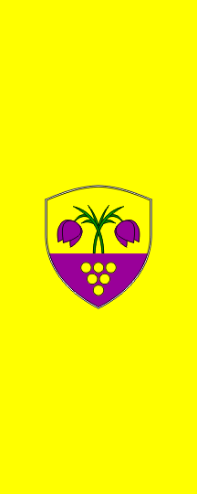 The flag is in proportions 2:5, yellow with the municipal coat of arms set in the middle. The text of the Decision clearly states that the flag when used horizontally should have the coat of arms appropriately rotated.