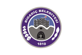 The flag of Bigadiç (photo) is white with the municipality's emblem in the middle. "BİGADİÇ BELEDİYESİ" means "Bigadiç Municipality".
