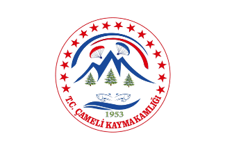 The flag of Çameli (photo, photo) is white with the municipality's emblem in the middle. "Belediyesi" means "Municipality".