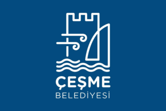 The flag of Çeşme (photo) is white with the municipality's emblem. The flag is also used vertically, either white or blue (photo). "Belediyesi" means "Municipality".
