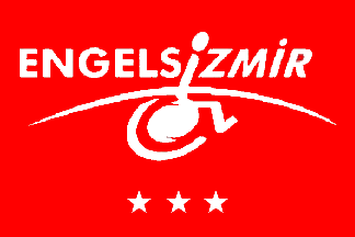 The emblem of Accessible İzmir is made of the white silhouette of a person in a wheel-chair, whose bust and head forms the "İ" of "İZMIR" in "ENGELSİZMİR", written horizontally near the top of the flag.