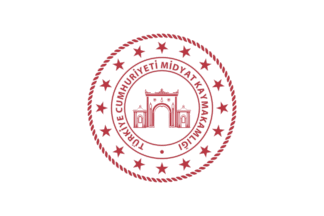 The flag of the Midyat district government (photo) is white with the government's emblem. "Türkiye Cumhuriyeti" means "Republic of Türkiye"; "Kaymakamlığı" means "District government".