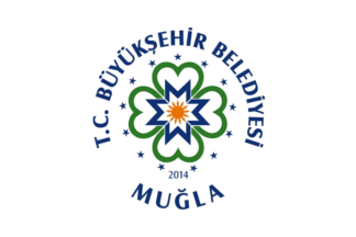 The flag of Muğla (photo), used horizontally or vertically, is white with the municipality's emblem. "T.C." stands for "Türkiye Cumhuriyeti", "Republic of Türkiye". "Büyükşehir Belediyesi" means "Metropolitan municipality".
