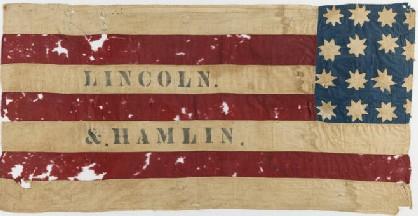 Lincoln & Hamlin Campaign Flag. 13" x 8.25" glazed cotton flag with 31 stars in the canton, inscribed on the stripes: "For President, Abram Lincoln. For Vice President, Hannibal Hamlin"; c. 1860. [Photo credit: Heritage Auctions.]
