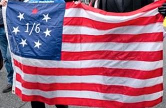 A pro-Trump flag with a blue-canton with 1 red star (representing "January") and 6 white stars (representing the "6th" day of January) all of which [1/6] refer to January 6, 2021, when the U.S. Electoral College cast a majority of votes in electing Joeseph Biden over Donald Trump to be inaugurated as the next U.S. president -- just a few days later on Jan. 20, 2021. Thereby, then-Pres. Trump failed in seeking re-election to a second four-year term. Then-Pres. Trump urged his followers to dispute the then on-going Electoral College voting, which while causing a riot and invasion of the U.S. Capitol building (where the Electoral College was meeting), failed to thwart the E.C. from eventually electing Biden as president. This activity is referred to as part of the "STOP THE STEAL" movement, when Pres. Trump claimed that his opponents were trying to "steal" the election by overcounting "fake" pro-Biden election votes/ballots . This pro-Trump flag honors the pro-Trump demonstrators/rioters who failed to thwart the proceedings of the E.C. on Jan. 6, 2021. This flag was seen being paraded by pro-Trump supporters in Washington, DC, on the 5th anniversary [Jan. 6, 2026] of the E.C.'s election of Biden over Trump.