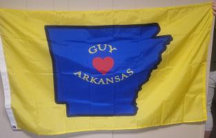 The flag was adopted in 2017 after the previous flags had deteriated in the period of over decade of ussge. I was sent a photo of the current, as well as the former city flag by the city administration on Facebook. The flag is a yellow field with a blue outline of Arkansas. In the center of the outline is a red heart with the city and state names encircling the heart. The heart possibly refers to the city's motto "A Small Town With a Big Heart," which are found on the city's welcome signs.