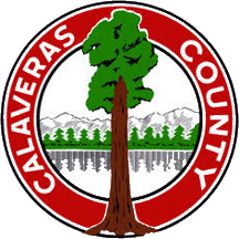 A white flag bearing the seal depicting a giant redwood tree extending across the whole seal, including the outer red ring and behind it an image of mountains and forest reflected in a lake.