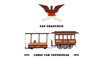 For its usage regarding the event, it is rather surprising it is relatively common. It depicts in its center, over a white field, a Clay Street Hill Railroad Company streetcar, the first successful one in the city; it depicts a passenger car connected to the main one for its pilot on the left. Above it reads "SAN FRANCISCO", with the city's emblem placed above the text depicting an eagle rising from flames with a ribbon underneath it reading the motto "ORO EN PAZ, FIERRO EN GUERRA". Under the streetcar is text that reads "1873 CABLE CAR CENTENNIAL 1973".