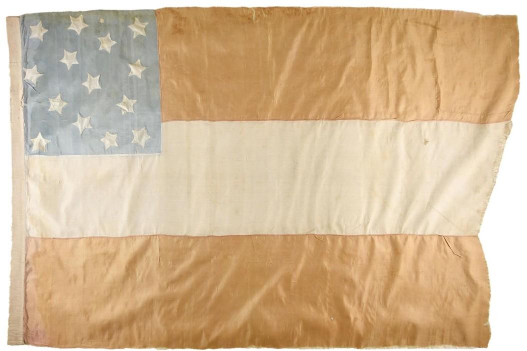 A 14-star "Stars and Bars" variety of the CSA's first national flag, all hand sewn. The flag is constructed of light weight silk. It measures 41" hoist, 2" cotton sleeve, 62" on fly, canton is 19" x 17.5" with double-applique 3" silk stars. This flag belonged to Lt. Russell Caples, of the "Searcy Missouri Cavalry". From his letter: "APRIL of 1865 a tough remnant of our old regiment fought under General Kirby Smith....Returning home to Glasgow, I kept my sash and the flag under which I had fought so many battles. Mother had died and father [Confederate chaplain] was mortally wounded by a cannon shell during the battle of Glasgow [October 15, 1864]. I arrived home with no job and two half sisters to support." Russell Bigelow Caples (1841-1915) entered service as private in "Searcy Sharpshooters" in 1862 was promoted to Lieutenant serving till June 7, 1865, when he was given his parole of honor at Shreveport, Louisiana. The Searcy Sharpshooter's served in western theatre under Generals Earl Van Dorn & Sterling Price. Upon his return home finding such devastation, he turned to law, becoming an attorney and later a judge till his death in 1915. From an earlier note by William M. Grimes-Wyatt, 24 January 1996: "The fourteenth star was for Maryland, whose governor was under house arrest and whose legislature was disbanded until the jailed members were replaced in a election where all voters had to take an oath of allegiance to the federal government."