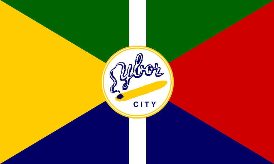 The flag is divided into four triangular quarters (per saltire), yellow at the hoist, green at the top, red at the fly, and blue on the bottom. Overlaying the center is a white disk resembling a seal, the outer edge of which has a white band bordered in gold. In the lower half of the disk is a gold cigar slanting up from the hoist toward the fly, with a blue tip at the hoist end. Over the cigar in script is Ybor, in white outlined in blue. Below the cigar, in small blue letters, is CITY. A narrow white vertical stripe runs from the center edges of the disk to the top and bottom edges of the flag. The colors come from the flags of the original countries of the city’s many ethnic groups. A rather comical “Pledge of Affection” for the flag reads, in “Spanglish”: