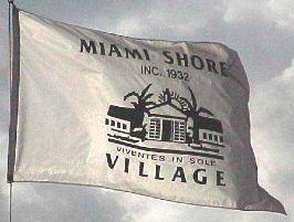 The village flag is shown on the village website [2]. It is white with a black emblem made of a landscape of the village (houses, palm trees, sun), surmounted by MIAMI SHORES / INC. 1932 and surmounting VIVENTES IN SOLE (Latin, living in the sun) / VILLAGE.