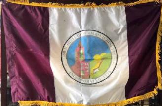 The original version of the flag of the Town of Ludlow had maroon stripes and the seal's outer circle was white. "Our town's flag, designed by Jeffrey Teixeira in 1973, is a symbol of our community's resilience and spirit. We are fortunate to have one of the original 1974 Bicentennial parade flags in our collection, which serves as a reminder of our town's storied past with manufacturing and agriculture."
